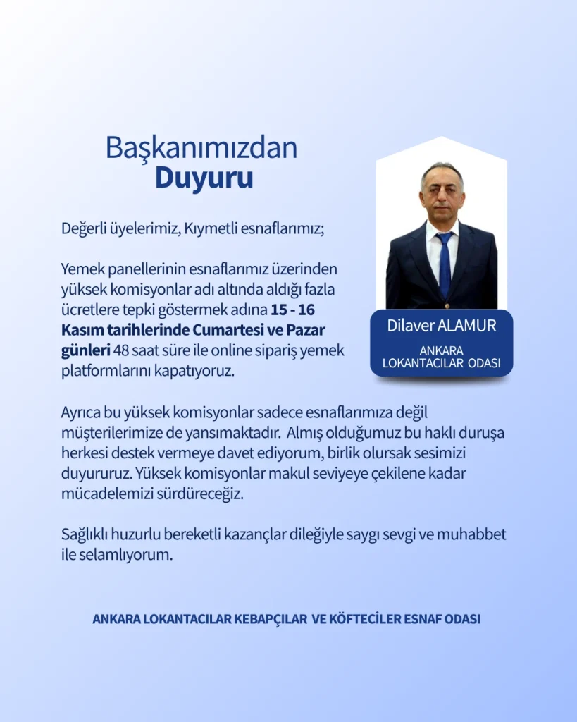 Ankara Lokantacılar Kebapçılar ve Köfteciler Esnaf Odası, Başkan Dilaver Alamur önderliğinde, online yemek sipariş firmalarının yüksek komisyon oranlarına karşı başlatılan “Dijital Boykot” çağrısına yoğun katılım gösteren tüm üyelere teşekkür mesajı yayımladı.